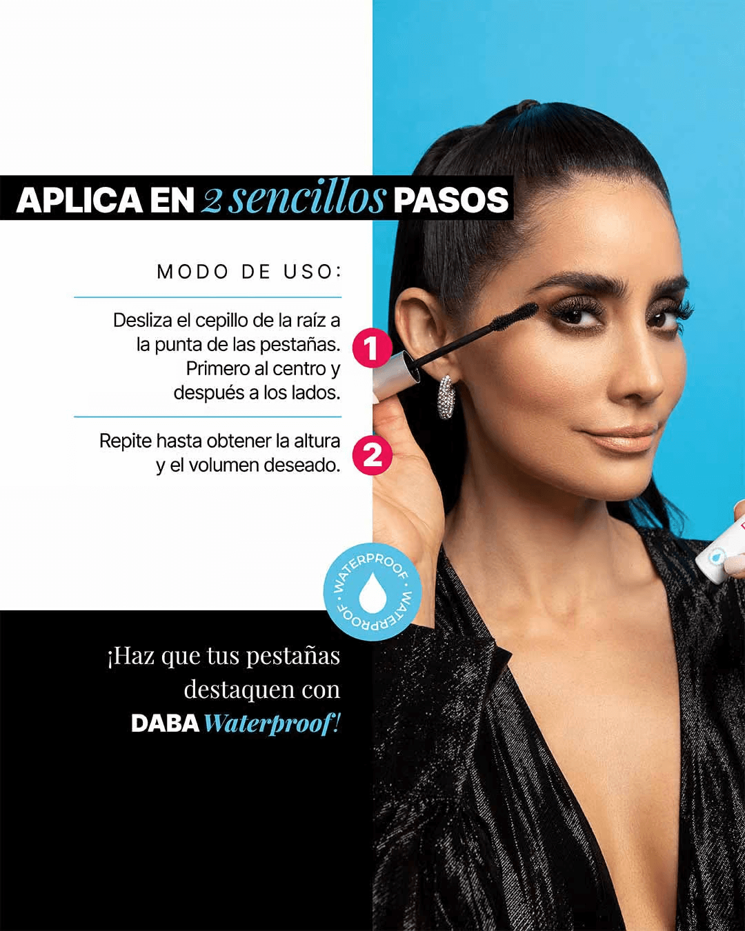 Nuestra Máscara DABA Waterproof es el complemento perfecto para tus pestañas, diseñada para resistirlo todo. Su fórmula de larga duración garantiza un efecto de volumen, longitud y rizo perfecto durante todo el día. Además, es el aliado ideal para potenciar los efectos del fortalecedor de pestañas DABALASH, asegurando una combinación perfecta para unas pestañas impresionantes.